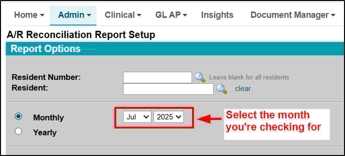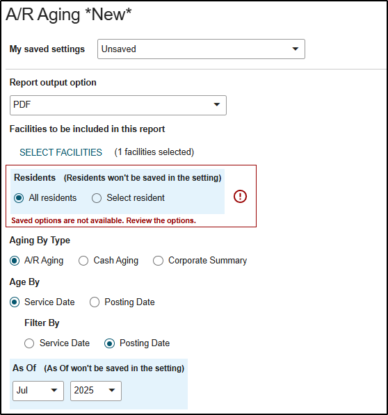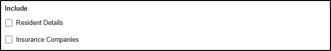 - Include: Resident details: uncheck this box (so it's faster to run the report)