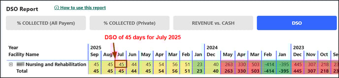 - In the example below, we pick July 2025 (a closed month) for Nursing and Rehabilitation facility. Its DSO is 45 days.