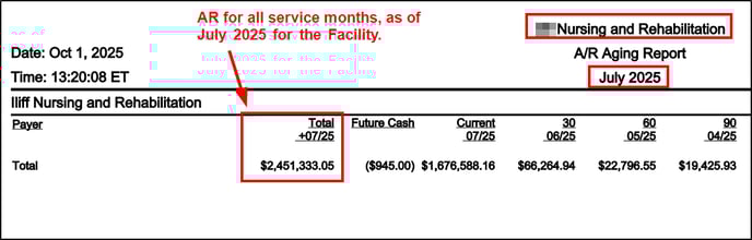 - This amount is the AR for all service months, as of July 2025 for the Facility. In our example, it is $2,451,333.05