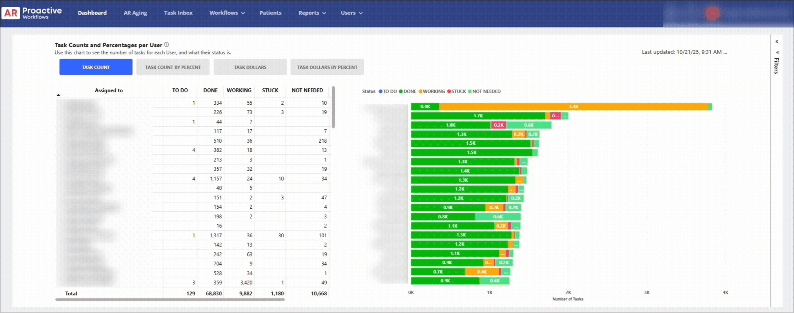 For example, you can drag "Associated with" to the top level, to group by Workflow, then see the break down by User.