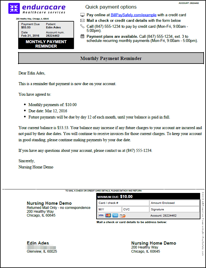 - If the patient falls behind, they will receive a Past Due and then a Final Demand reminder over 2 months.
