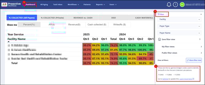 - Tell our system which General Ledger (GL) codes you use for Writeoffs. You can get this information from your AR or accounting department. (If you don't know the GL codes that are writeoff's, we can still run the Percent Collected report, but it will not be completely accurate. )