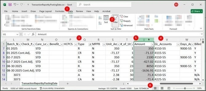 - Open the CSV file exported on Step 2 in Excel: Filtering the Writeoff transactions for this month will depend on whether your company has set GL Codes for them or not.