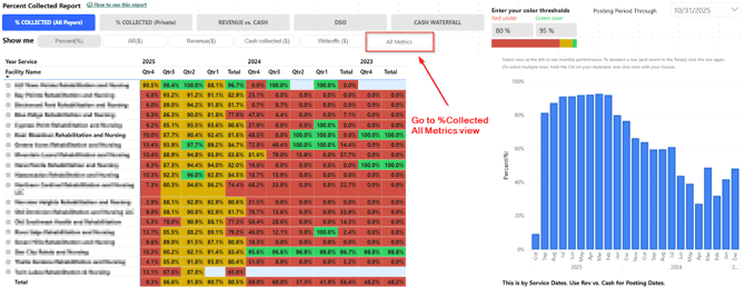 - Once in the All Metrics view, in the ‘Posting Month Through’ selector on the top right corner of the report, select the last closed posting month. In our example, we’ll be selecting September 2025, since this test is being done in October 2025.