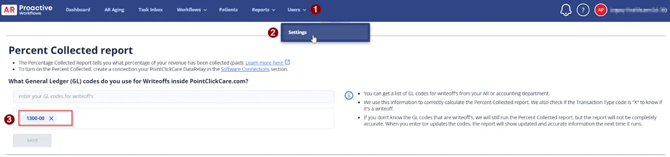 - Check if you have GL codes set for writeoffs. To see this, go to the Settings > Percent Collected page.