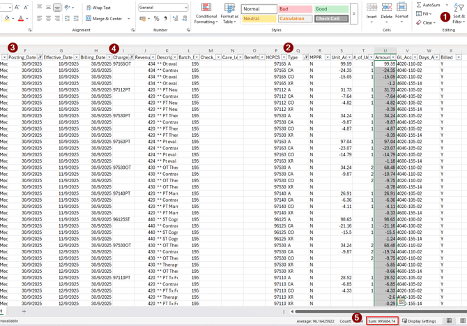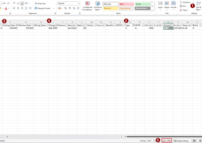 - If any of these Charge Codes appears on Column I, add the values in Column U "Amount" by clicking on the column header to highlight all the values. If none appear, that means you have no writeoffs for the selected month.