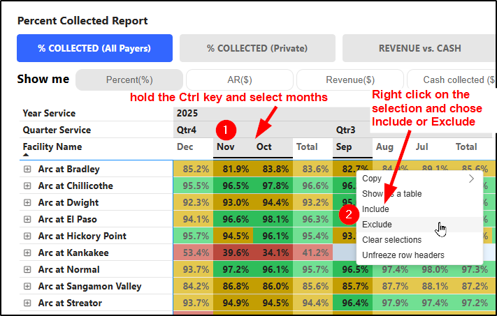- Include: this will filter for only the selected months (and exclude all other months)