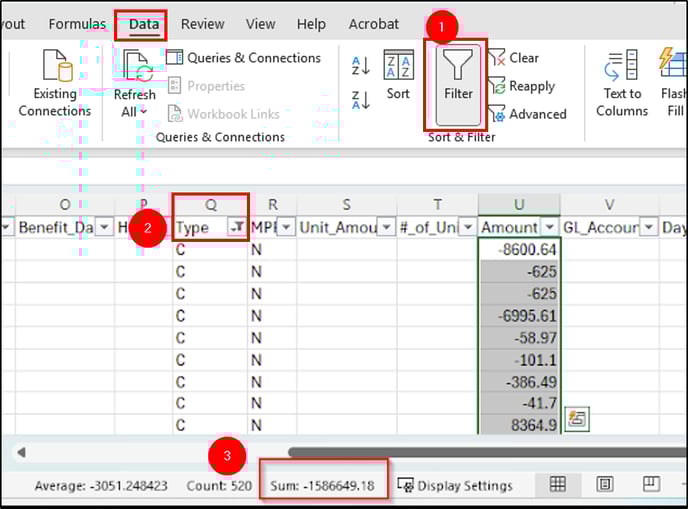 - Add the values in Column U "Amount" by clicking on the column header to highlight all the values.