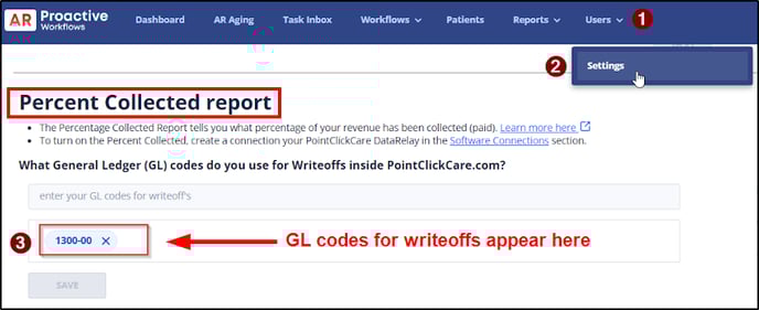 - Check if you have GL codes set for writeoffs. To see this, go to the Settings > Percent Collected page in AR Proactive.