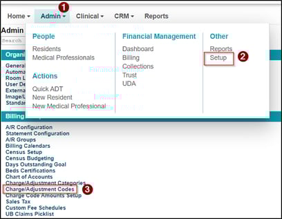 - Go to Admin > Setup, and under Billing Setup, select Charge/Adjustment Codes