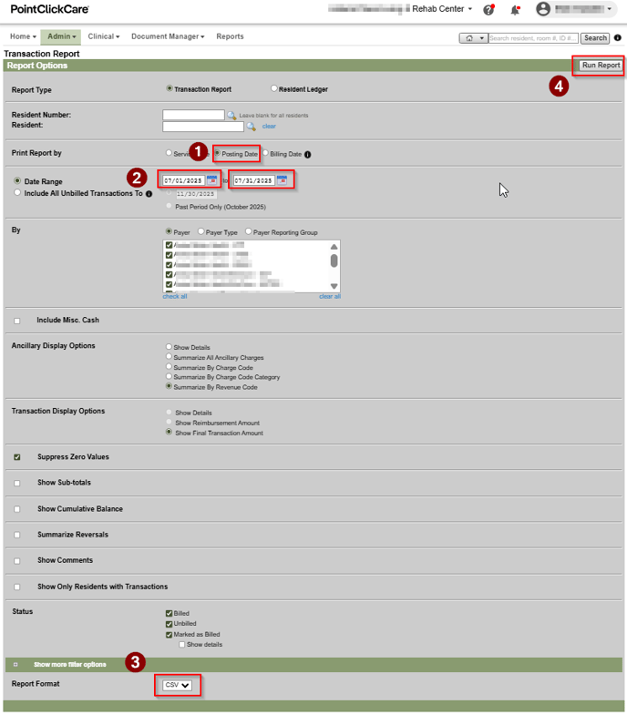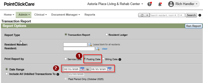 - Note: select a month that is closed in PointClickCare. This will eliminate differences due to recent transactions posted on an open month.