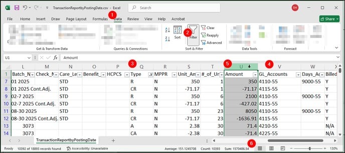 - On Column V "GL_Accounts" filter out (uncheck) the GL Codes you supplied on the Settings > Percent Collected page. If none appear, continue.