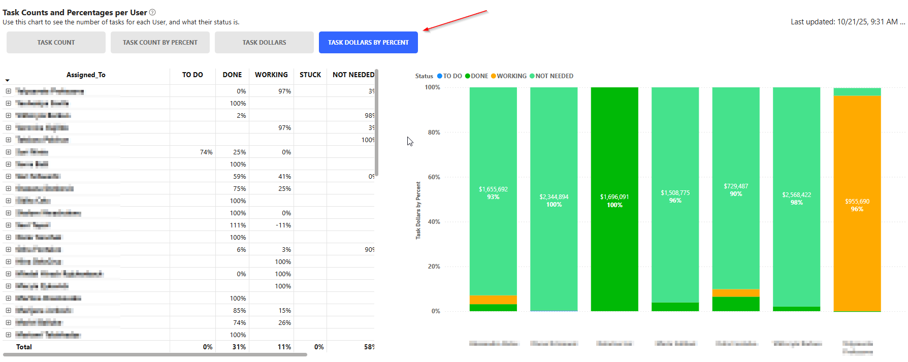 This tab shows the percent by dollars of each user's Tasks per status, such as Done or Working, for example.